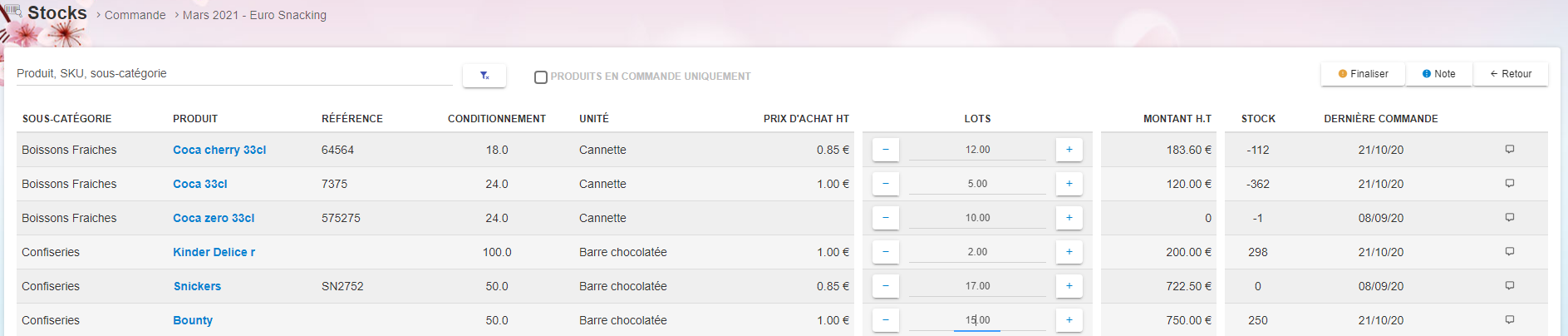 Une fois le fournisseur sélectionné, vous saisissez pour chaque produit la quantité de lot / conditionnement commandés