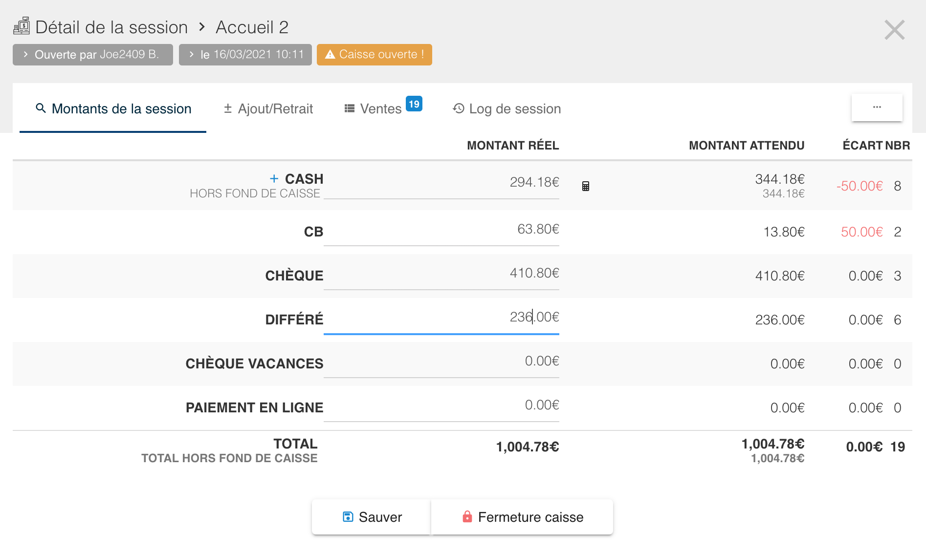 La différence entre les colonnes "montant réel" et "montant attendu" représente l'écart de caisse et est automatiquement calculée et visible en rouge.