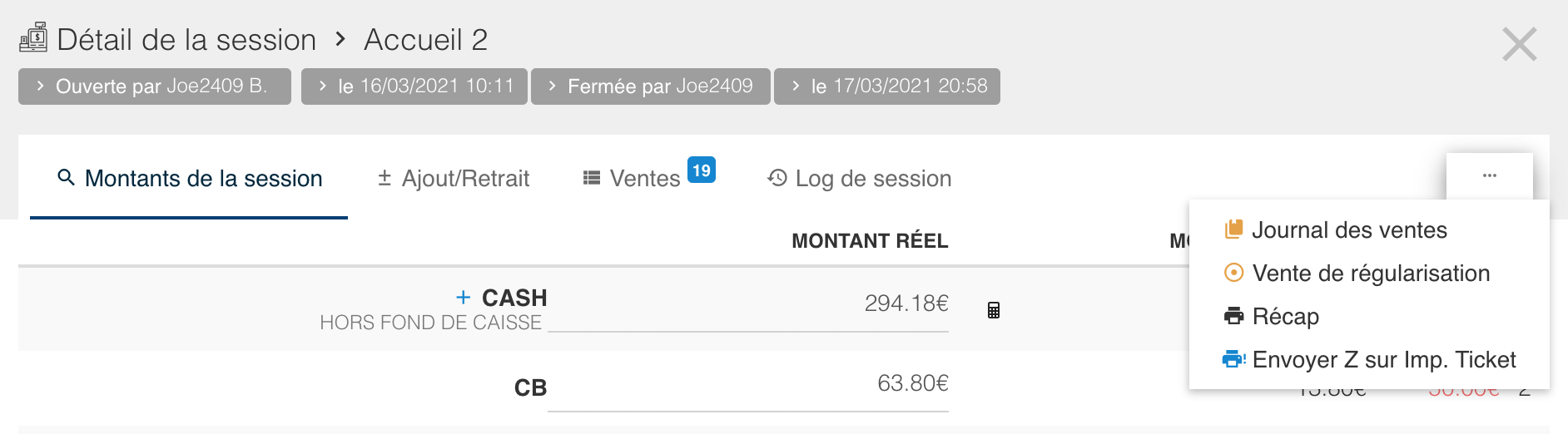 Vous accédez à cette option via Menu / caisse / sessions de caisse, il faut cliquer sur le nom de session de caisse concernée et puis les trois petits points dans le coin haut/droite: