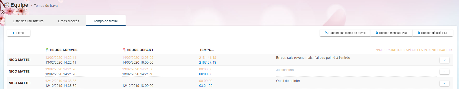 Rapports journalier ou mensuel, global ou détaillé, ainsi que modifications des données saisies par le collaborateurs. Via Menu / Equipe / Temps de travail