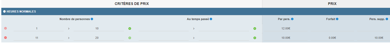 Vous pouvez ainsi déterminé le prix de l'activité (par personne, un forfait ou les deux) pour chaque type d'heure.