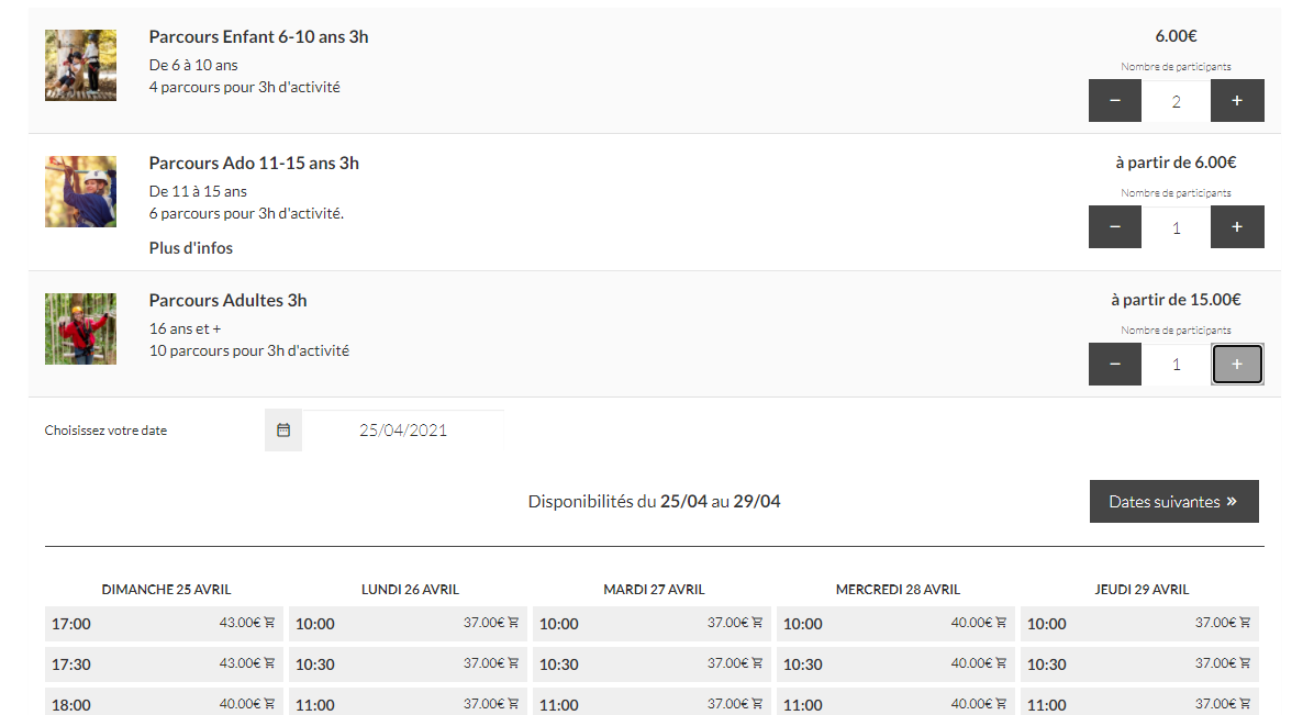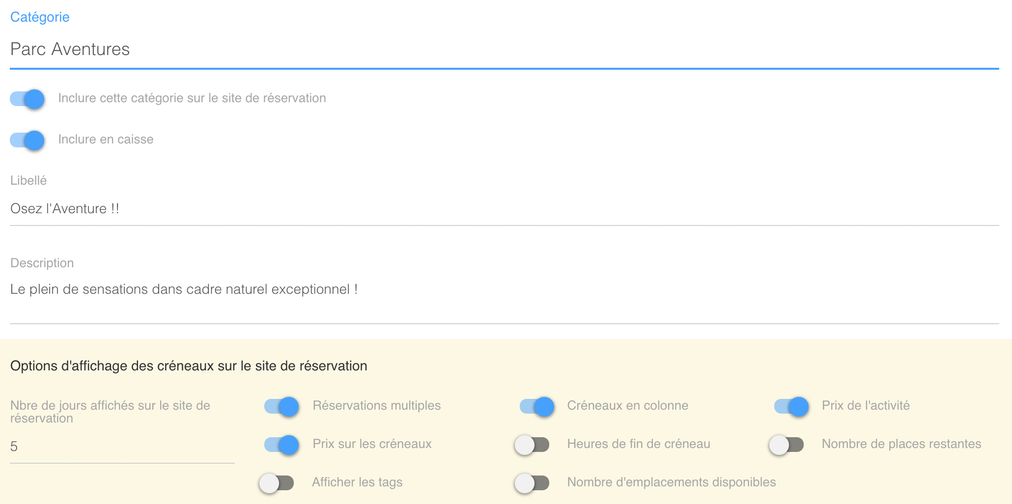 Exemple du paramétrage de la catégorie Parc Aventure sur le site de réservation :