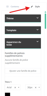 - Définissez la police, taille et couleur de chaque style (titre, paragraphe, lien…) via Apparence du texte.