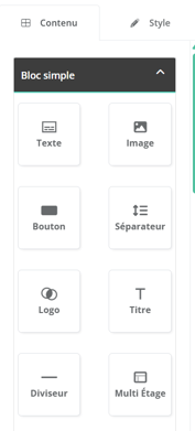 Les blocs de contenu sont les éléments que vous pouvez faire glisser dans votre mise en page pour construire l’email. Ils vous permettent d’insérer du texte, des images, des boutons, des séparateurs, des liens, et bien plus encore.