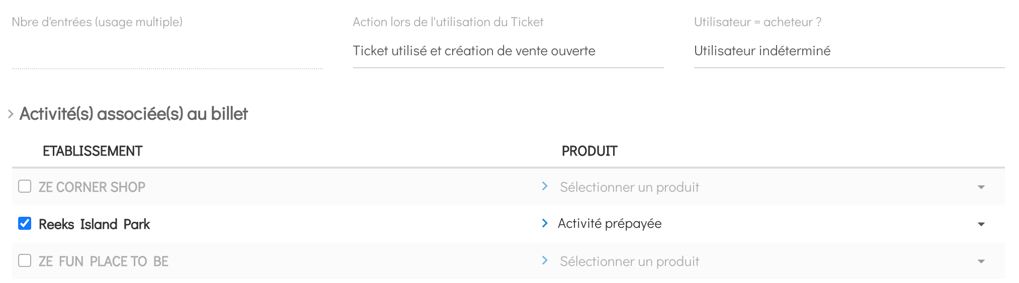 Une vente sera automatiquement créée et clôturée lors de l'utilisation du billet. La vente doit alors contenir une activité, définie au niveau de la colonne "produit" de la section "Activité associée au billet"