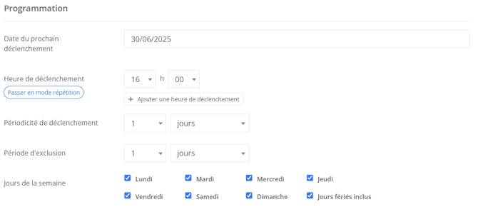 - Périodicité de déclanchement: il s'agit de définir à quelle fréquence vous envoyez la campagne. Typiquement cela sera 1 jours
