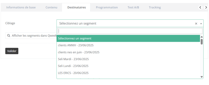 Dans cet onglet, vous allez choisir le segment de votre base de contacts Qweekle auquel envoyer votre campagne.