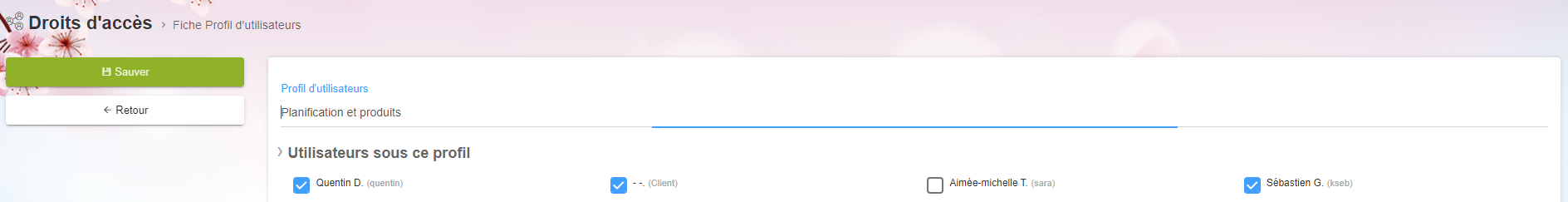 La partie supérieure de l'écran vous permet de sélectionner les utilisateurs liés à ce profil. A noter qu'un utilisateur peut être lié à différents profils.