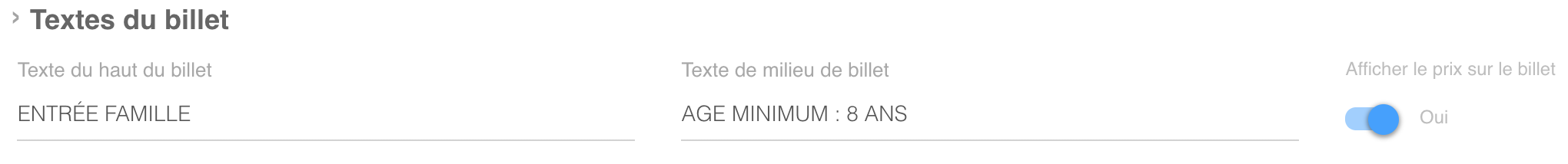 En plus du nom du billet vous pouvez insérer, au-dessus et en-dessous de celui-ci, deux textes complémentaires.