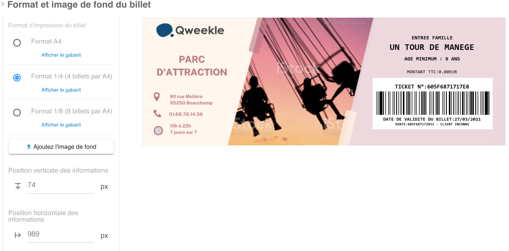 - il permet également de prévoir l'espace utile à l'insertion par Qweekle des informations nécessaires (nom du billet, code barre, date de validité, ...)