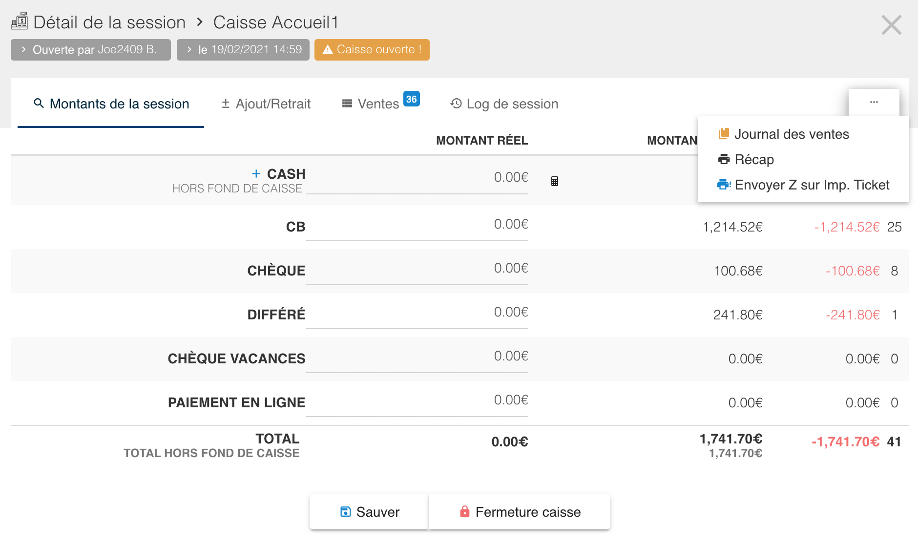 Aperçu des ventes en cours et modifications de celles-ci, ajout ou retrait d'espèces, export du journal des ventes, log de session, impression du récap de la session (Z temporaire)