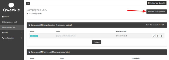 Pour créer une nouvelle campagne, cliquez sur Nouvelle campagne SMS.