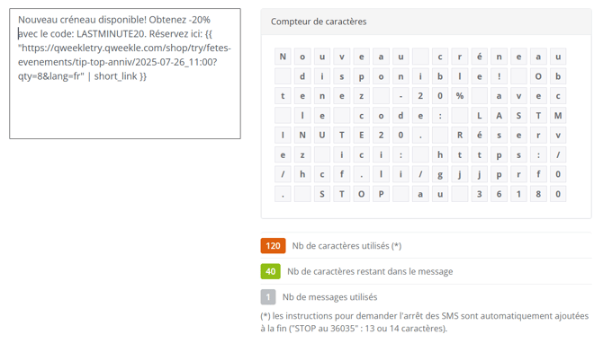 💡 Les SMS que vous envoyez sont considérés comme des SMS marketing. Conformément à la législation en vigueur, ils ne peuvent être envoyés que du lundi au samedi, entre 8h et 20h.