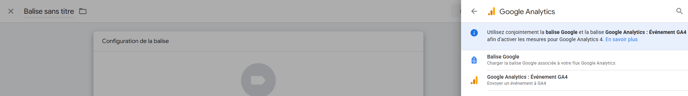 Maintenant nous pouvons faire le lien avec Google Analytics 4, dans la section "Balise" créez une nouvelle balise, et sélectionnez la configuration de balise "Google Analytics : Evénement GA4".