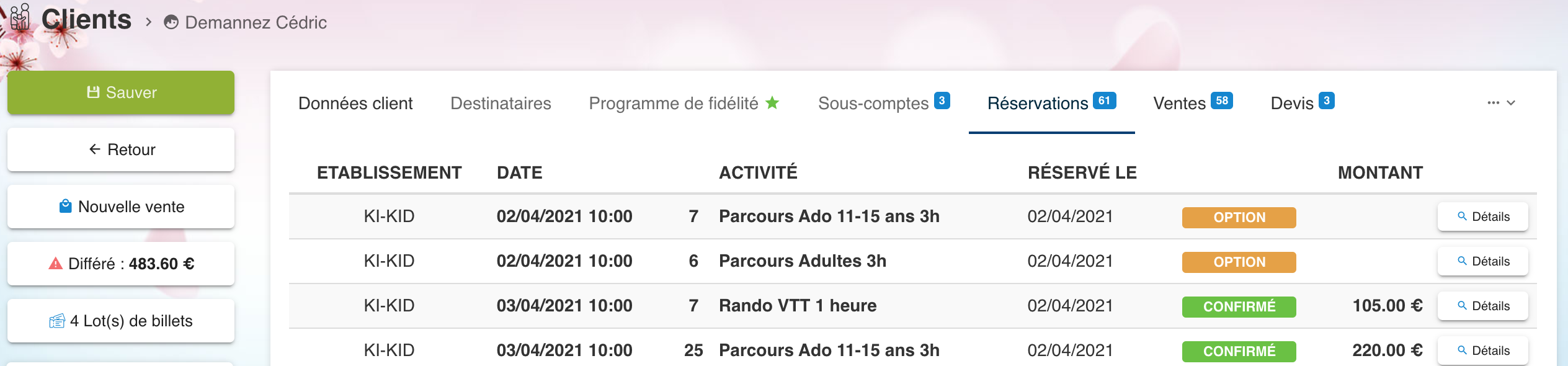 - accéder aux détails de chacune d'entre elles en cliquant sur le nom du client ou sur l'activité
