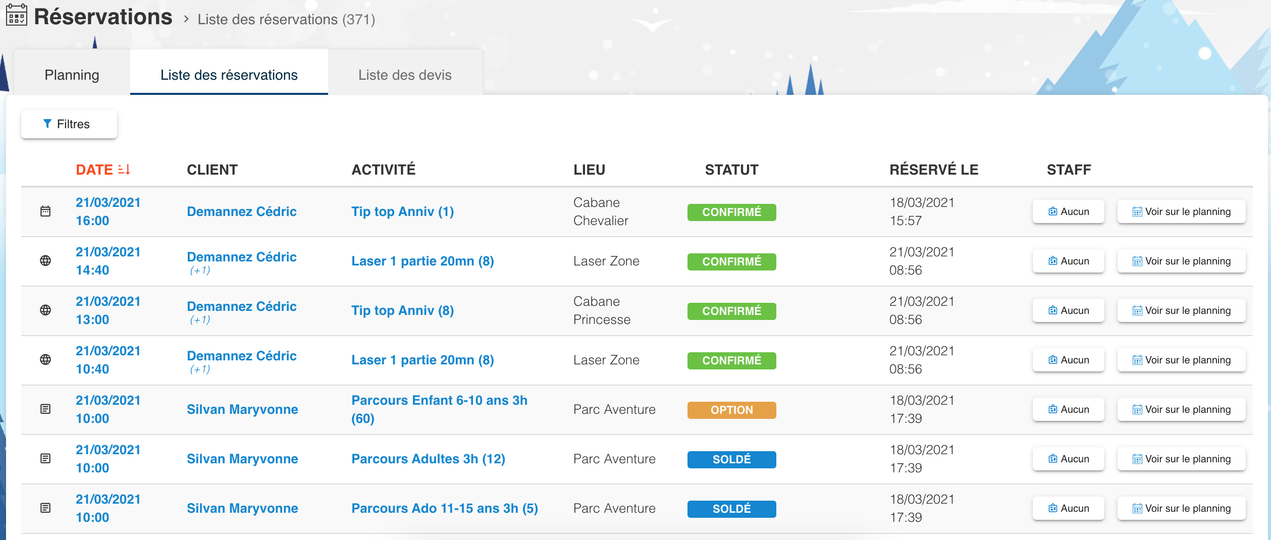 - Chaque en-tête de colonne est "cliquable", afin de trier par date d'événement, de réservation, de client, d'activité, ...