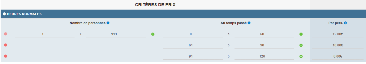 Vous pouvez ainsi déterminé le prix de l'activité (par personne, un forfait ou les deux) pour chaque type d'heure.
