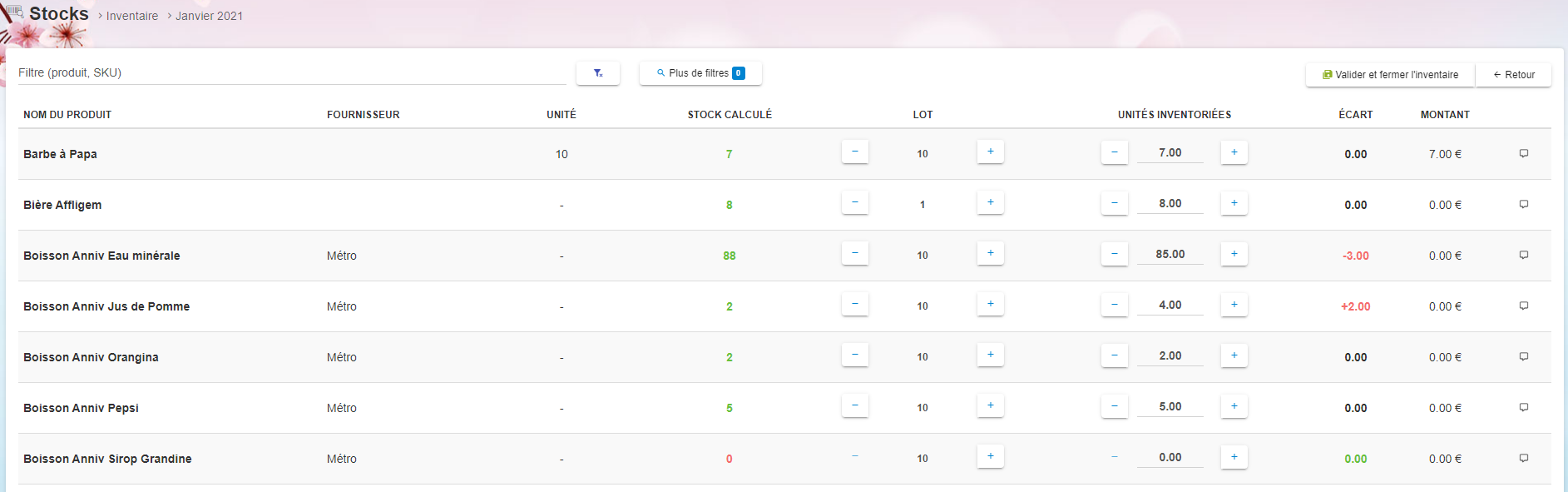 Une fois la saisie des quantités de l'ensemble des produits, vous valider et fermer l'inventaire (opération irréversible)