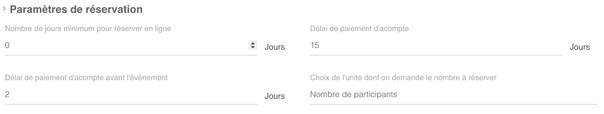 Délai de paiement d'acompte avant l'événement : en amont de la date de l'évènement (ex : vous voulez que tous les acomptes soient payés 2 jours avant l'évènement)
