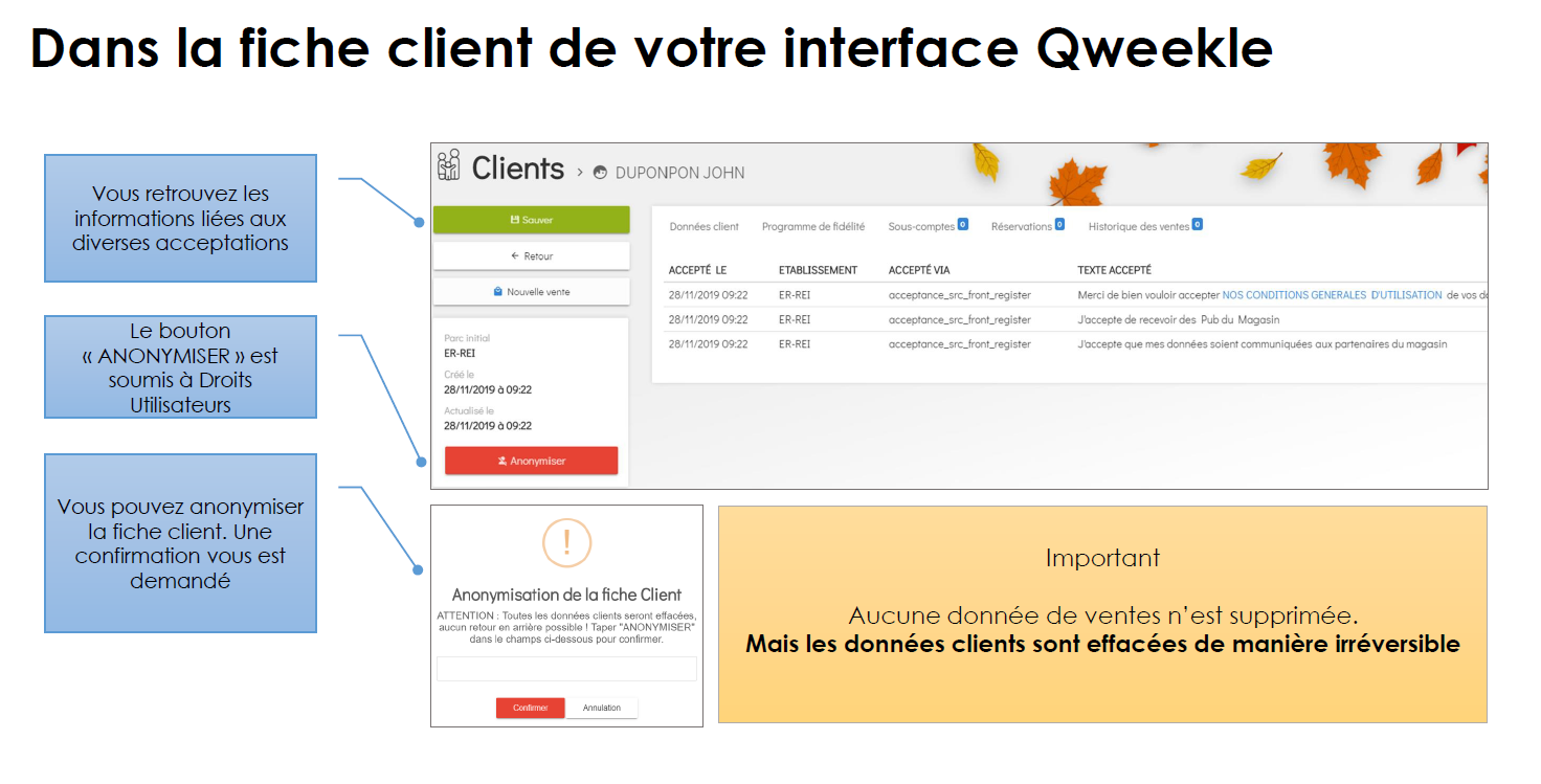 Objectifs : Acceptations & données, Clients dans Qweekle conditions générales de ventes, d'utilisations, facultatives ou obligatoires (CGU, CGV…) et droit à l'oubli (RGPD)